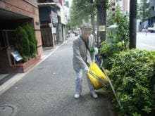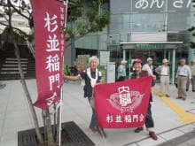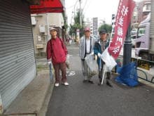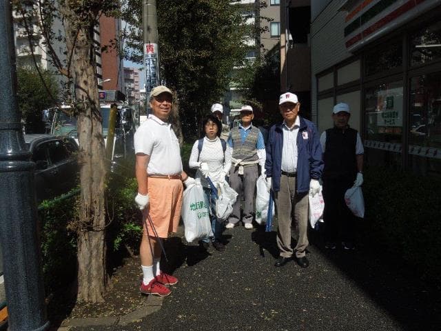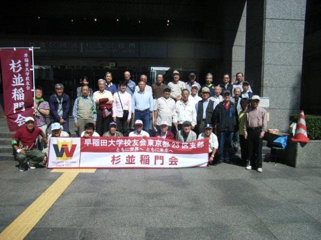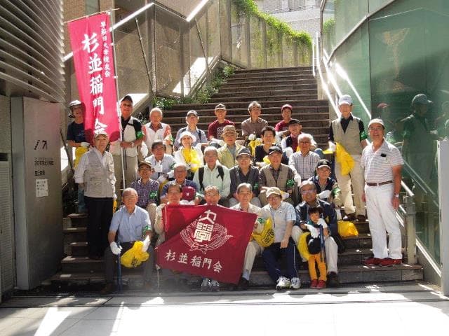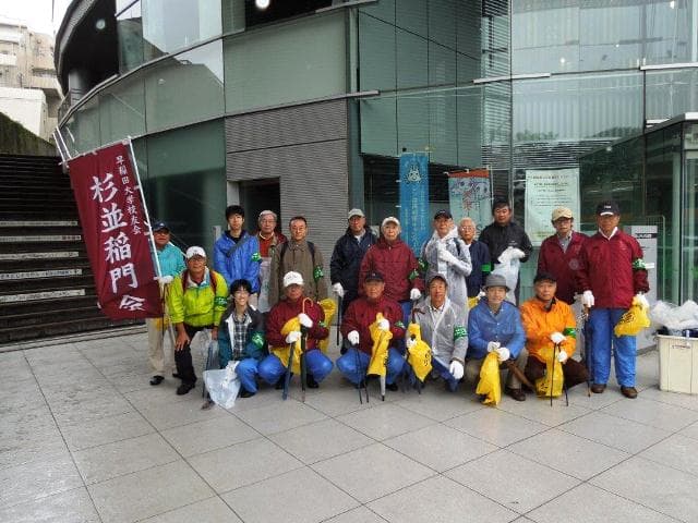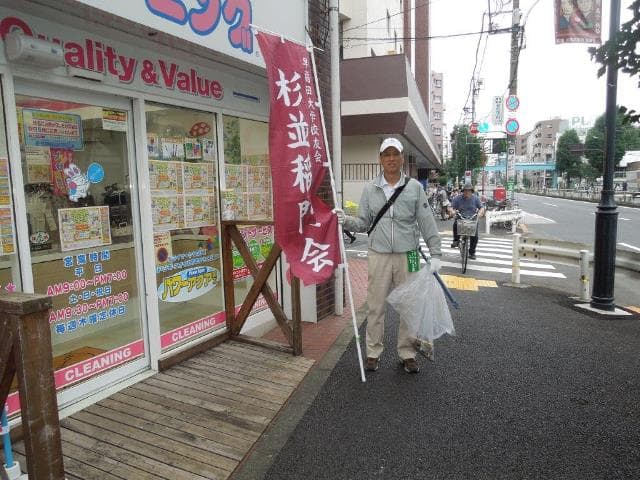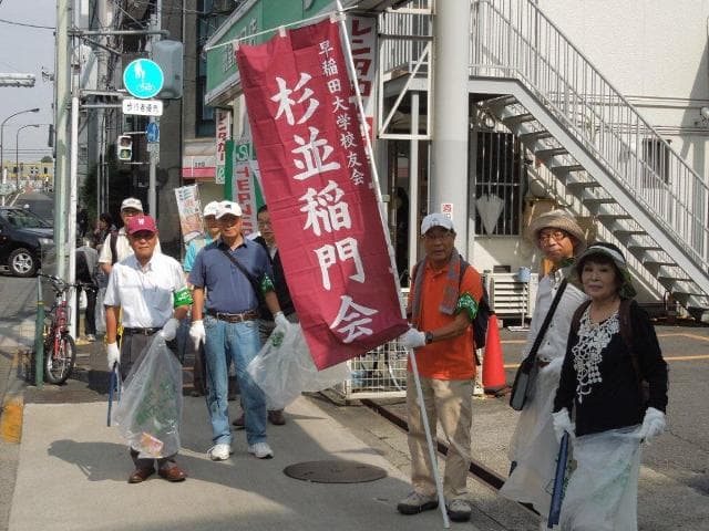 例年通り、新高円寺駅から区役所までの青梅街道歩道を約1時間掛けて清掃した。年中行事になったせいか予想以上にゴミが少なく、毎年実行して来た成果が上がっている事を感じる(45L炭カル袋15個の出来高)。杉並稲門会の幟旗を立てて作業していると、杉並在住の校友から「入会したいのですが!」の声が掛かり、会員増強キャンペーン時期と丁度重なり、実に気分の良い出来事であった。
