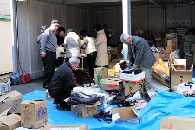 点余の大量の品物が集荷場に集まりました。 集荷場はいつも杉稲会の会議場に提供して戴いている根本特殊化学(株)さんのガレージを使用させて戴き、3/12〜16