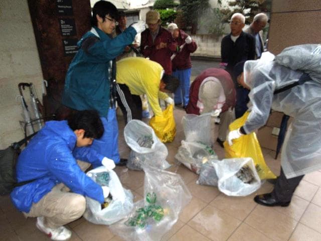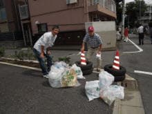 今回は早稲田大学の学生環境NPO『環境ロドリゲス』から現役学生2名(篠崎智博君と栗田久樹君)が参加してくれた。雨でぬれた沿道のゴミ拾いは結構大変であったが、皆さん無事に清掃を終えゴミの分別も済ませてから、近くの『寿司屋:魚河岸』でランチを食べて解散となった。