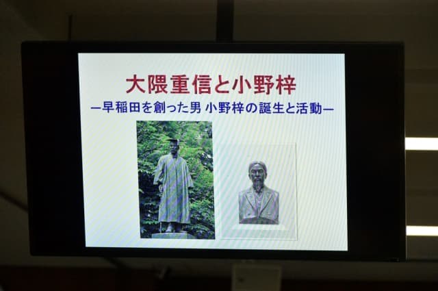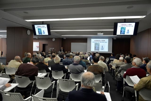 11月17日(土)、勝田政治氏(国士舘大学教授)を講師に、母校中野国際コミュニティプラザ一階会議室にて開催。83名(近隣稲門会八名含む)参加。萩原企画委員長の開会挨拶に続き久保田会長の挨拶。委員長の講師紹介後、「明治国家と大久保利通」と題する講演が始まる。