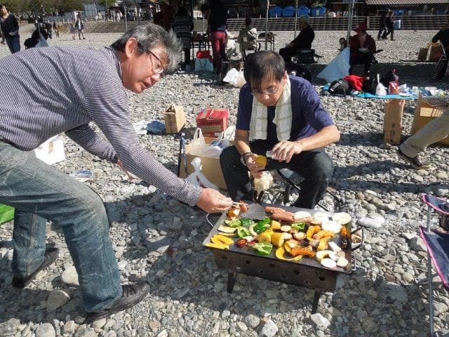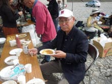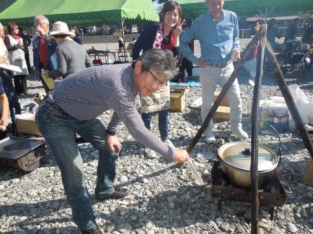 好天に恵まれて気温もグングン上がってお昼には22度と初夏を思わせる気候の下、総勢80名(主催者側の発表)が秋川渓谷の河川敷に集合。小柴雅人中野稲門会副会長から「これから芋煮会を開催します!」とのご発声でスタート。ご家族連れや近隣の稲門会(杉並・新宿・渋谷・千代田・武蔵野)の校友の皆さん、また、今回はWISH(WASEDA INTERNATIONAL STUDENT HOUSE)から留学生十数名も参加してとても楽しく賑やかに始まりました。