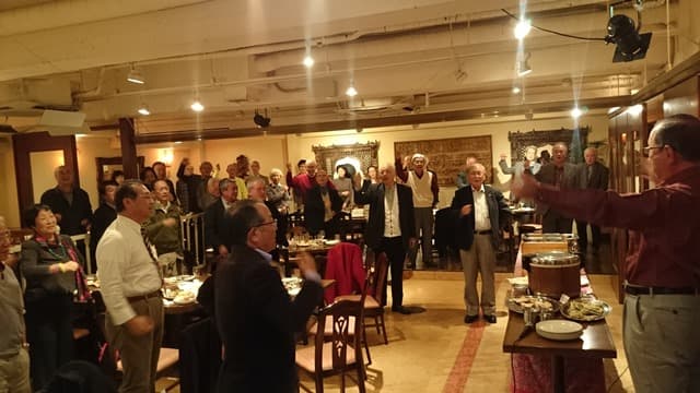 ブロック世話人会が終了して午後5時から6時過ぎまで「忘年会」を行いました。第4ブロック・水野健樹様に乾杯の音頭を取って頂き、和気藹々と相互の懇親を深めることが出来ました。最後は、恒例となりました第2ブロック・名取義久様の指揮による「校歌斉唱」を皆で謳ってお開きとなりました。