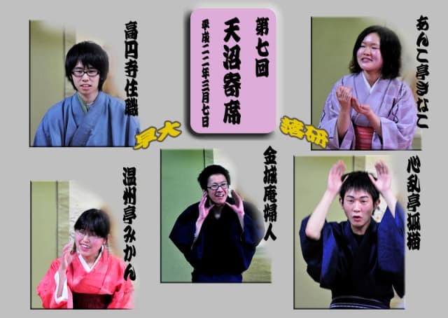 【温州亭みかん(女性):文学部2年、うなぎ】、【川柳亭遊呂:文学部4年、そこつ長屋】、【中田中田中:政経2年、ハンドタオル】、【楽枝亭北也(女性):文学部4年、やかん】、【順風亭まん丸:文学部4年、鮫講釈】。