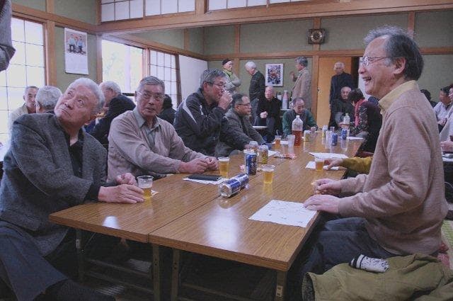 客席は街の寄席と違って、ちょっとおぼつかない人にはハラハラしながらより熱い声援が強まり、ベテランには「ほう、やるナ」と感動の拍手が沸く。そこには約半世紀をへだてた先輩と後輩のほのぼのとしたものが流れている。会場には終演後の合評会?反省会?用に一升瓶、つの樽、にごり酒、お菓子など種々の差し入れ品が景気よくずらりと並んでいる。落語が終わり小休止の後、学生さん達は和服を普段の服に替え、ほっとした表情で、先輩たちの待つ席にやって来る。自然といくつかのグループに分かれ、差し入れの品々を中に、噺を褒めたり、専攻は何?などの質問があったり、批評があったりの交流が小一時間ほど続き、午後4時過ぎのお開きとなった。