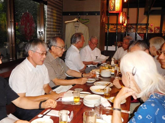 暑い夕暮れ、20名の会員が元気に集まった。 先ず、開会に先立ち久保田貞雄会長に挨拶を頂き、続いて参加者最年長