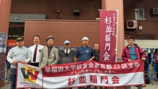 当部会は創部以来23年、早稲田スポーツの観戦&応援を行っています。駅伝・野球・ラグビー・レガッタ・卓球・アメフト・サッカー・テニス・バスケット・アイスホッケー・バレーボールの11競技の観戦&応援をしています。