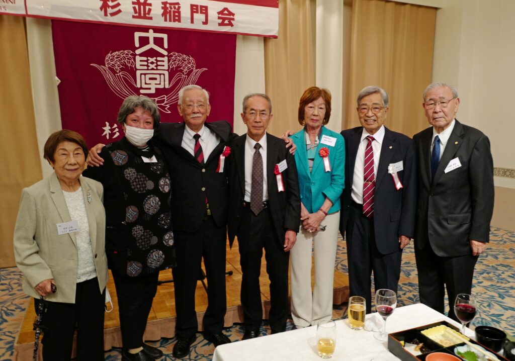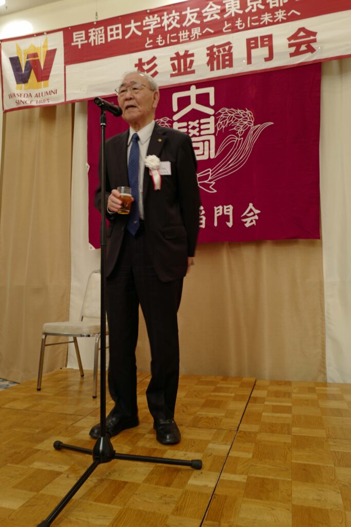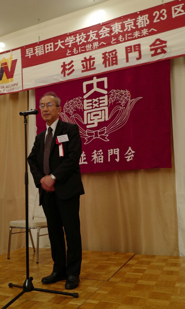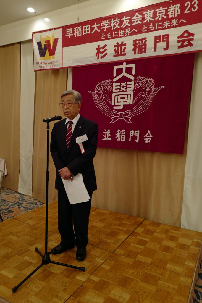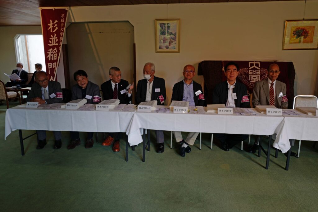 【来賓】山名早人/早稲田大学理事、坂倉みどり/早稲田大学東京都23区地域担当副部長、金森捷三郎/早稲田大学校友会・東京都23区支部長、旭正勝/世田谷稲門会会長、髙田宜美/中野稲門会会長、諸江昭雄/武蔵野稲門会会長(敬称略)
