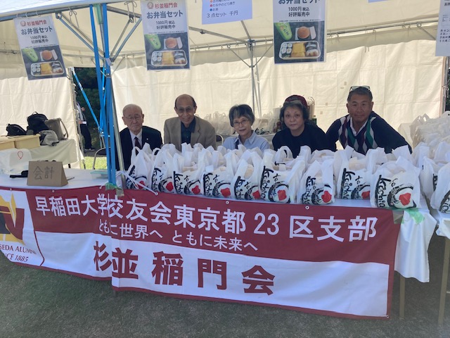 このような環境の中、杉並稲門会の模擬店では多くの校友の皆様並びに杉並稲門会の皆様のご協力で、『古市庵のお寿司・たねやのどら焼き・おーいお茶のペットボトルのお弁当セット』が、販売から約2時間で完売をいたしました。誠にありがとうございました。来年は、コロナやインフルエンザ等が沈静化してアルコール販売を含む飲食が自由にできることを祈っております。