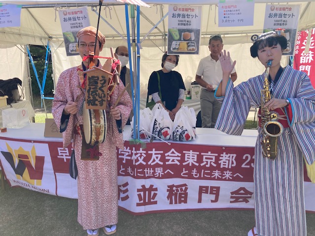 参加された校友の皆様には明るい笑顔が戻り多くの参加者が音楽やダンスのパフォーマンスを楽しまれていた印象を受けました。杉並稲門会の模擬店の前では、キッズチアの若さ溢れる活発なステージやゴスペルママの素晴らしい歌声、ニューオリンズジャズバンドのリズムカルな音色が響き訪れた人々を楽しませていました。