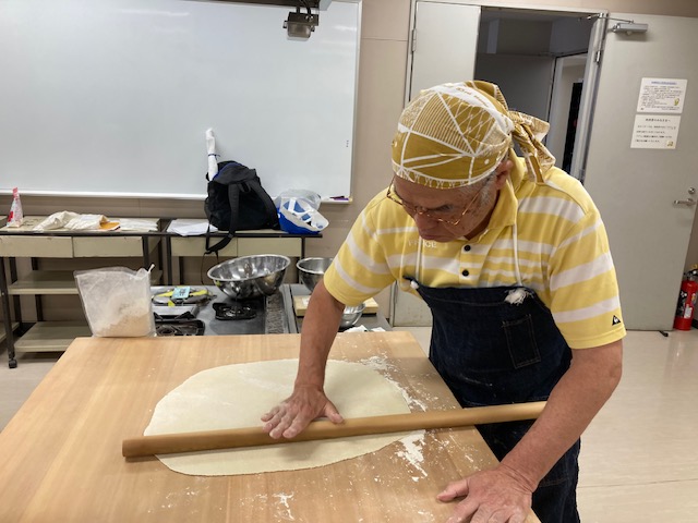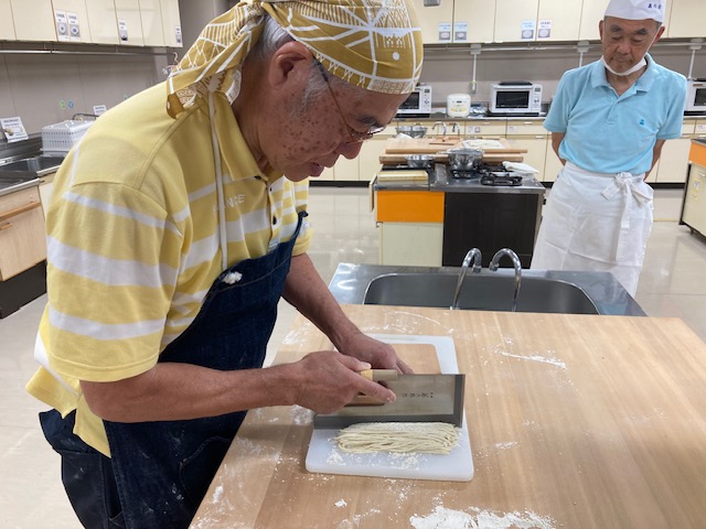 当日は、この道15年の松尾さんが模範実技を披露。参加者は、水回し、練り、のし、たたみ、切りといった厄介な作業に積極的挑戦していました。今回は初会合なので、ゆで、試食まではいきませんでしたが、次回は、自分で打ったそばを自分で食べる体験にチャレンジする予定です。