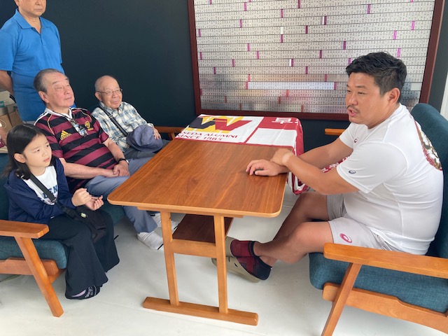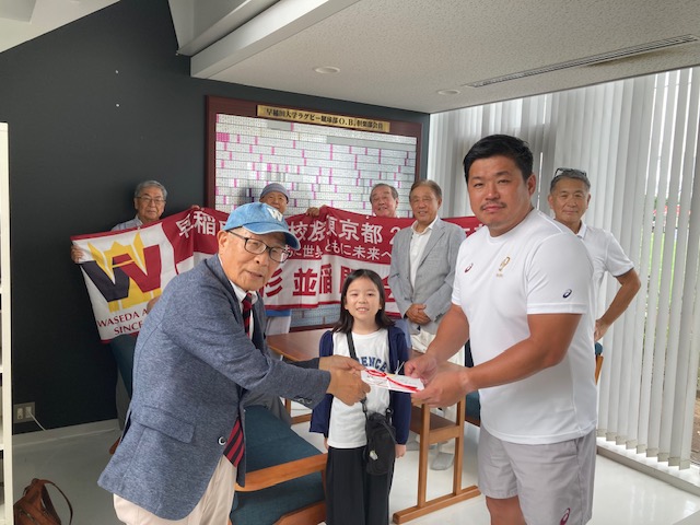 2025年7月13日(日)開催「早稲田大学ラグビー蹴球部『北風祭』」に、スポーツ観戦の会から「お祝い金:5万円」を大田尾監督にお手渡ししました。懇談会も大田尾監督とやりました。会場は、早稲田大学ラグビー蹴球部の倶楽部ハウス1階(上井草)の応接間です。金子守さんから「監督、先般の帝京大学戦の勝利、誠におめでとうございます。勝因は何でしょうか?」とのご質問に対して、『試合の入りが上手く行きました事が勝因ですね』と大田尾監督がお答えくださいました。