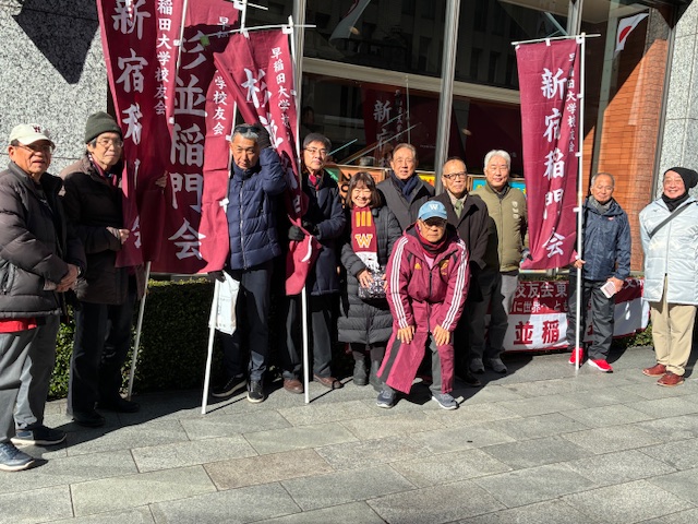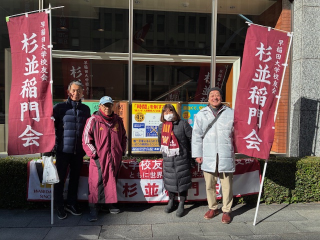 ④杉並稲門会の応援のぼり旗を掲げて応援する市村充さん・平賀英彦さん】