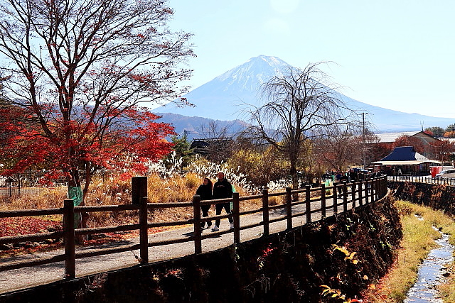 最後に、河口湖もみじ回廊へ。大勢の外国人観光客をかき分け、川沿いに頭上を覆うもみじを見上げたり、散り敷いた葉を見下ろしたりしながら撮影を楽しみました。