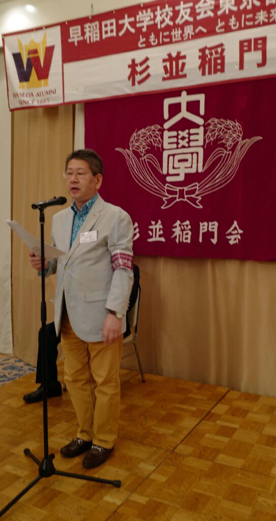 【来賓】木村俊明/早稲田大学東京都23区地域担当部長、志村博司/早稲田大学校友会・東京都23区副支部長、旭正勝/世田谷稲門会会長、髙田宜美/中野稲門会会長、諸江昭雄/武蔵野稲門会会長、桑島文彦/杉並三田会代表世話人、塙耕平/杉並三田会事務局長 (敬称略)