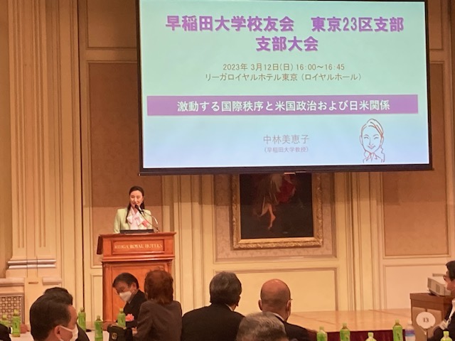 2023年3月12日(日)に4年ぶりに開催されました。23区稲門会の校友が290名(内、ご来賓10名)、杉並稲門会からは19名の皆さんが参加されました。会場はリーガロイヤルホテル3階ロイヤルホール。第1部は、早稲田大学中林美恵子教授の講演会です。「激動する国際秩序と米国政治および日米関係」の演題で約1時間の講演は、昨今の日米、米中、ウクライナ問題、台湾問題、米国の中間選挙などを分かり易くプロジェクターを駆使しての講演でした。田中愛治総長がご欠席されて渡邉常任理事より現在早稲田大学が取り組んでいる「早稲田大学の改革プロジェクト」について講演されました。
