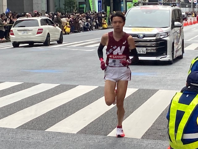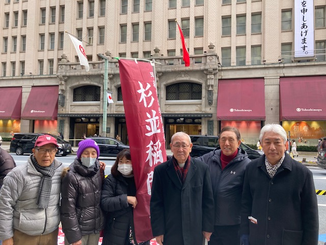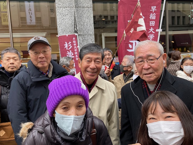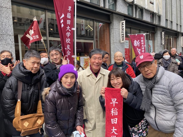 新年明けましておめでとうございます。本年もスポーツ観戦の会を何卒、宜しくお願いいたします。2024年新年恒例の「箱根駅伝」の観戦・応援ツアーを開催いたしました。今回は「第100回目」の「箱根駅伝」です。スポーツ観戦の会の観戦・応援ツアーを「復路10区」の日本橋丸善書店前にて開催しました。スポーツ観戦の会並びに杉並稲門会から下記9名の皆様が応援に駆け付けてくれました。「復路10区」早稲田最終走者は、昨年と同様【昨年2年生】「菅野雄太選手(3年・教育・西武学園文理)」です。