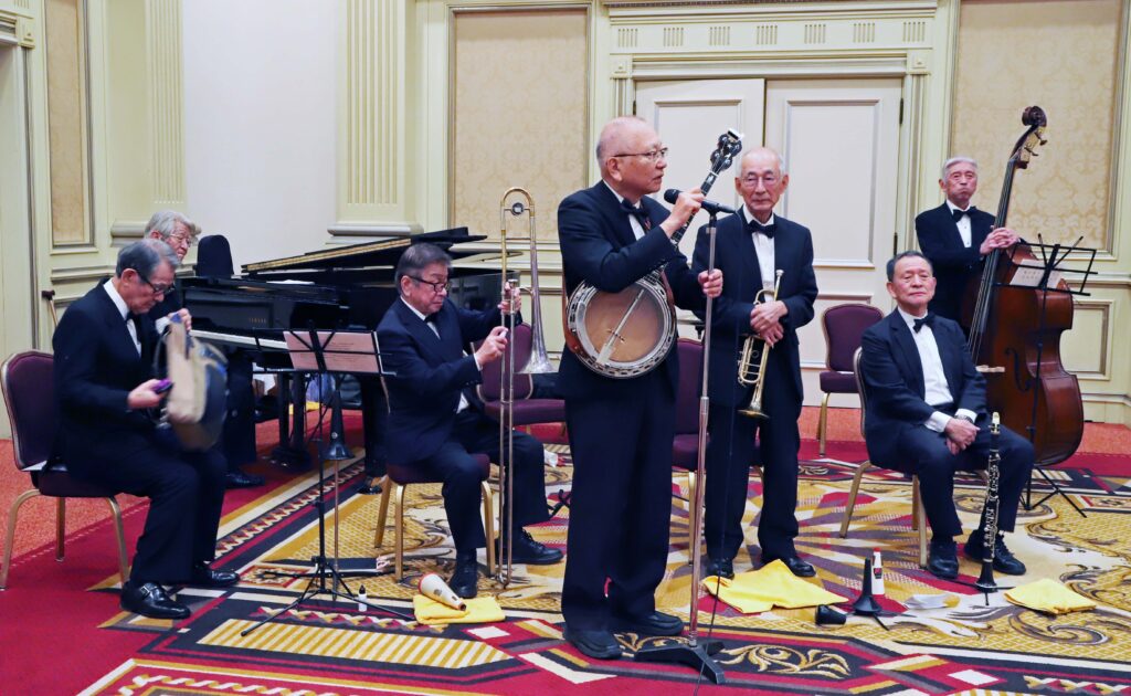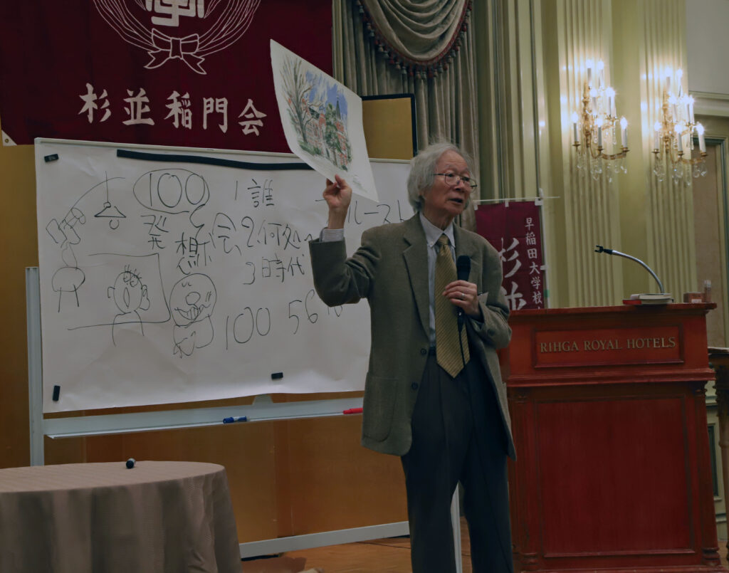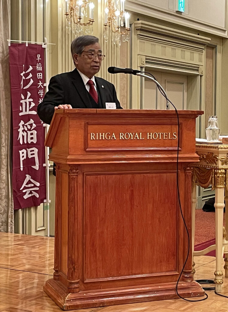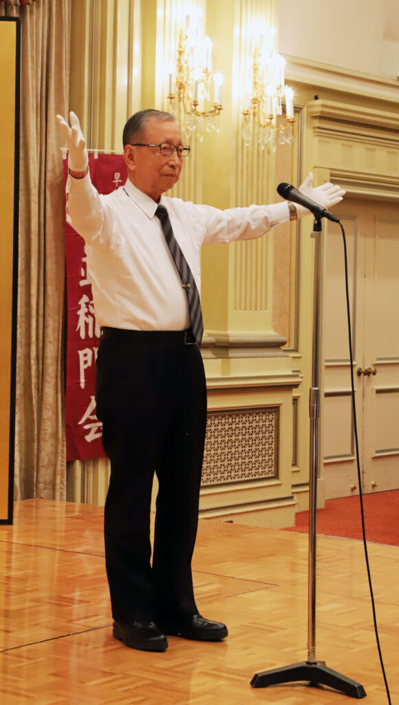 2024年11月9日(土)、「リーガロイヤルホテル東京」ロイヤルホールにて開催。参加者110名(含来賓)。「第一部/祝賀式と講演会」開会(司会・嗣永典子副幹事長)。長谷川將会長は「会員相互の交流をより深めていきましょう」と挨拶。心待ちの藪野健先生によるご講演(演題:「早稲田を歩く」)。絵画・芸術論からワセダの特色まで、板書とご自身の作品のご提示を織り交ぜられての濃厚なる1時間。一同へ素敵なお土産(早稲田大学文化推進部『キャンパスがミュージアム 藪野健の芸術』&大隈講堂のペーパークラフト)も配布されました。「第二部/祝賀宴会」冒頭、来賓を代表し本間敬之様・吉田誠男様よりご祝辞を賜りました。創立期からの大先輩・水野健樹会員(1955・政経)による乾杯後に祝宴へ。アトラクションは、「ナインティーウエストジャズバンド」による名曲演奏のかずかず。ラスト「聖者の行進」では藪野先生を始め一同で圧巻の練り歩きとなりました。名取義久顧問のリードで校歌(バンドによる生演奏!)斉唱とエール。加藤健副会長の御礼挨拶の後、恙無くお開きとなりました。此度も、実行委員長である尾上孝幹事長兼企画委員長お目配りのもと、当役各位がそれぞれの任をそれぞれ粛々とつとめることで、スムーズな流れに終始しました。当役皆様のご尽力の賜物と存ずる次第です。