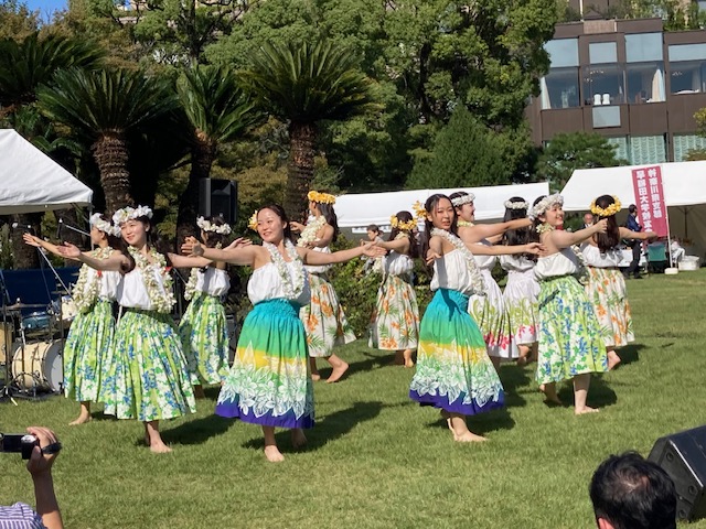 に座って和気藹々に食べ且つ飲んで語り合い、大隈庭園での催事―フラダンス・