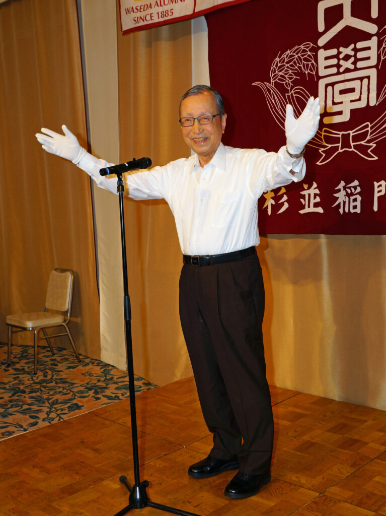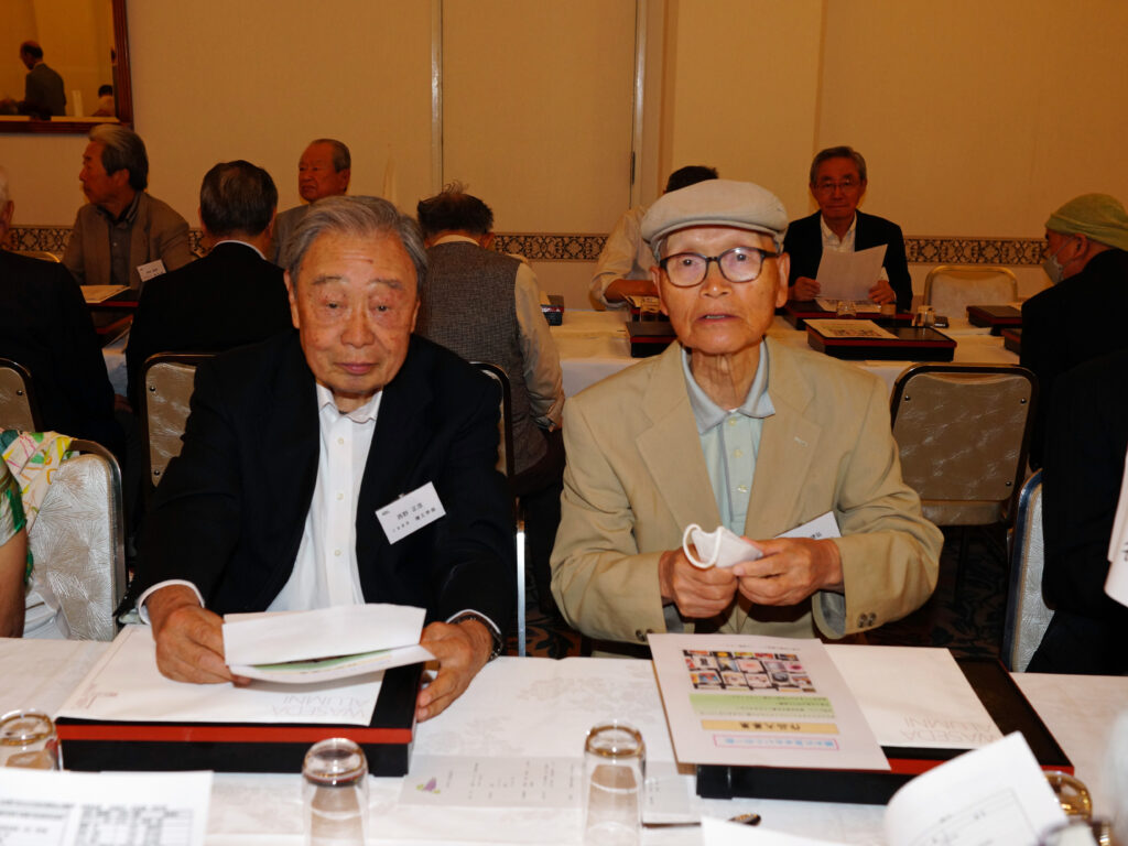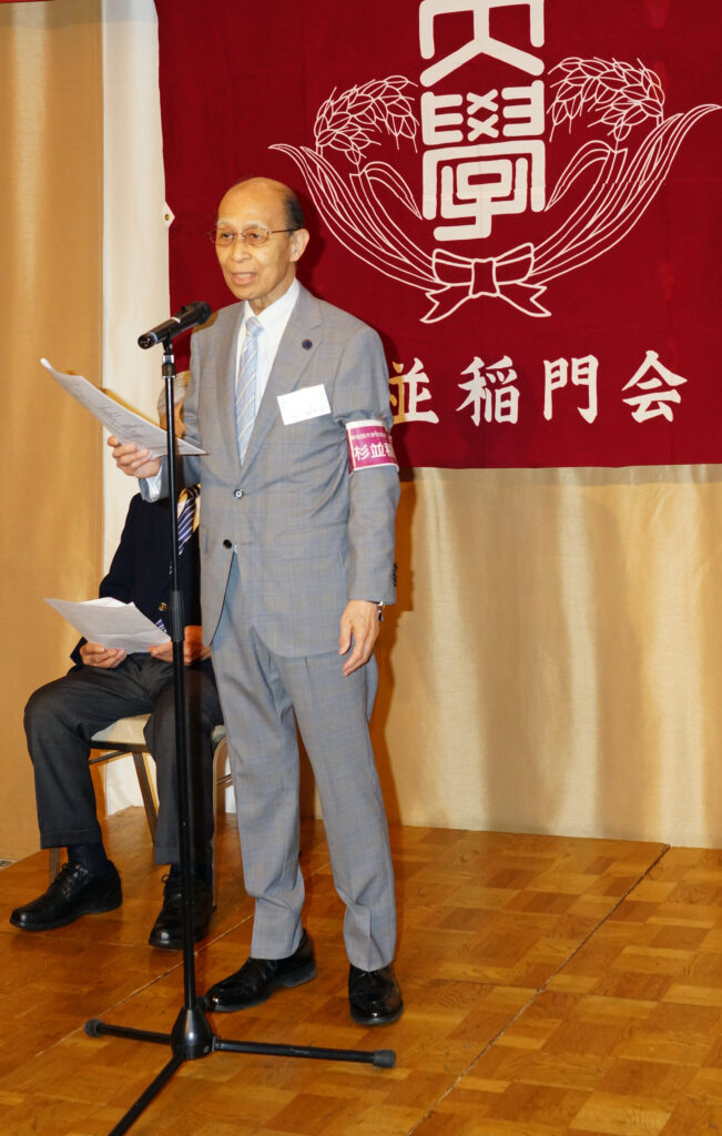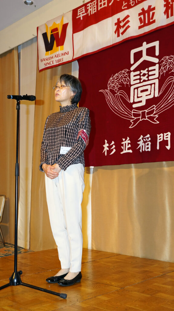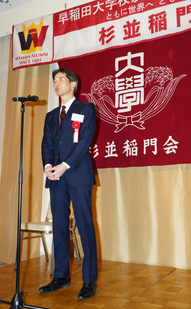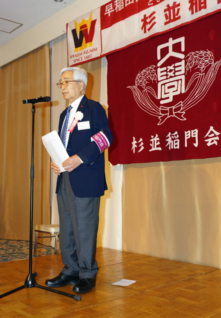 【来賓】木村俊明/早稲田大学東京都23区地域担当部長、志村博司/早稲田大学校友会・東京都23区副支部長、旭正勝/世田谷稲門会会長、髙田宜美/中野稲門会会長、諸江昭雄/武蔵野稲門会会長、桑島文彦/杉並三田会代表世話人、塙耕平/杉並三田会事務局長 (敬称略)