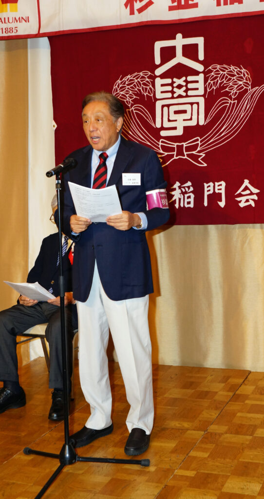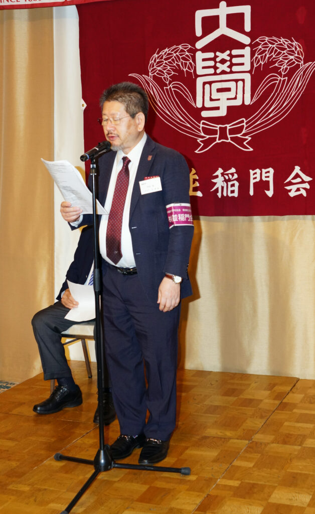 2024年5月18日(土)、杉並会館・孔雀の間において開催。参加者93名(含ご来賓)。午前11時、司会(嗣永典子副幹事長)より開会宣言。物故会員9名への黙祷後、長谷川將会長より挨拶(対面交流の大切さと参会者への謝辞)。引き続き会長を議長として議事へ。昨年度の活動および収支決算報告(中谷聡副幹事長)・会計監査報告(安藤政明監事)、今年度の活動および収支予算案提起(尾上孝幹事長)、その他の議案もすべて承認、議事は恙無く終了。ご来賓を代表し、大学本部からの木村俊明様と校友会からの志村博司様より、それぞれご挨拶を賜りました。引き続き石川清次会員(1948・理工)の力強いご発声による乾杯後、懇親会へ。恒例の新会員紹介(新規登壇者2名+新年会での登壇者6名)、名取義久顧問による漲るリードのもと高らかに校歌斉唱(1番&3番、エール有り)、山下早苗副会長の閉会の辞(本会開催に向け尽力された方がたへの謝辞)を以て全日程を終了。此度は稲門祭記念品の即売会も賑々しく復活。事務局業務分担も、順調に軌道に乗って来たように思われます。今回もお互い息災に集えた有り難さへ思いを馳せつつ、和気藹々とした語らいの余韻を楽しみつつ、の帰途でした。