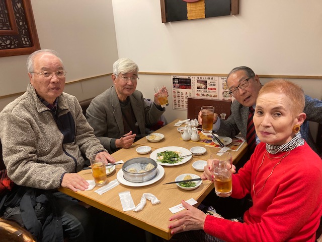 10区の菅野雄太選手(2年・教育学部・西武学園文理)は、順天堂大、國學院大、と4位~6位を争いながら団子状態で我々の前を疾走。大きな拍手を送りました。しかし、6位で大手町の読売新聞社前のテープを切りました。昨年のシード落ちからの復活を成し遂げてくれました。「復活ワセダ」を祝って、有志4名(福原さん、竹入さん、大田さん、加藤)で東京駅八重洲地下街の「中華料理店・一味玲玲」で「新年会」を開催しました。因みに、従前の「新年会」の会場「そじ坊(蕎麦屋)」は、無くなって(廃業?)いました。