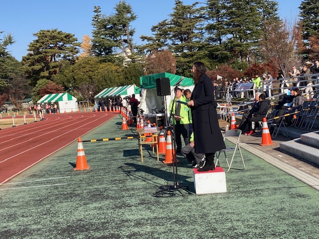 本日12月10日(日)、都立和田堀公園陸上競技場(済美山運動場)に、山下委員長と加藤 健委員で行き、大会会長・杉並区長 岸本 聡子様にご挨拶をさせて頂きました。岸本区長のスタートの号砲で、「女子中学校25校(福島県相馬市から1校参加)」が、9時45分に一斉スタートして「5区8.6km」の周回路を5人で襷を繋いで力走しました。「男子中学校24校(福島県相馬市から1校参加)」が、10時45分に同じ周回路を襷を繋いでスタートしました。西暦2000年を記念して始まった本大会も今年で24回目となり、杉並区の一大イベントとなっています。今後とも杉並稲門会として「地域貢献活動」の一環として参加して行く所存です。